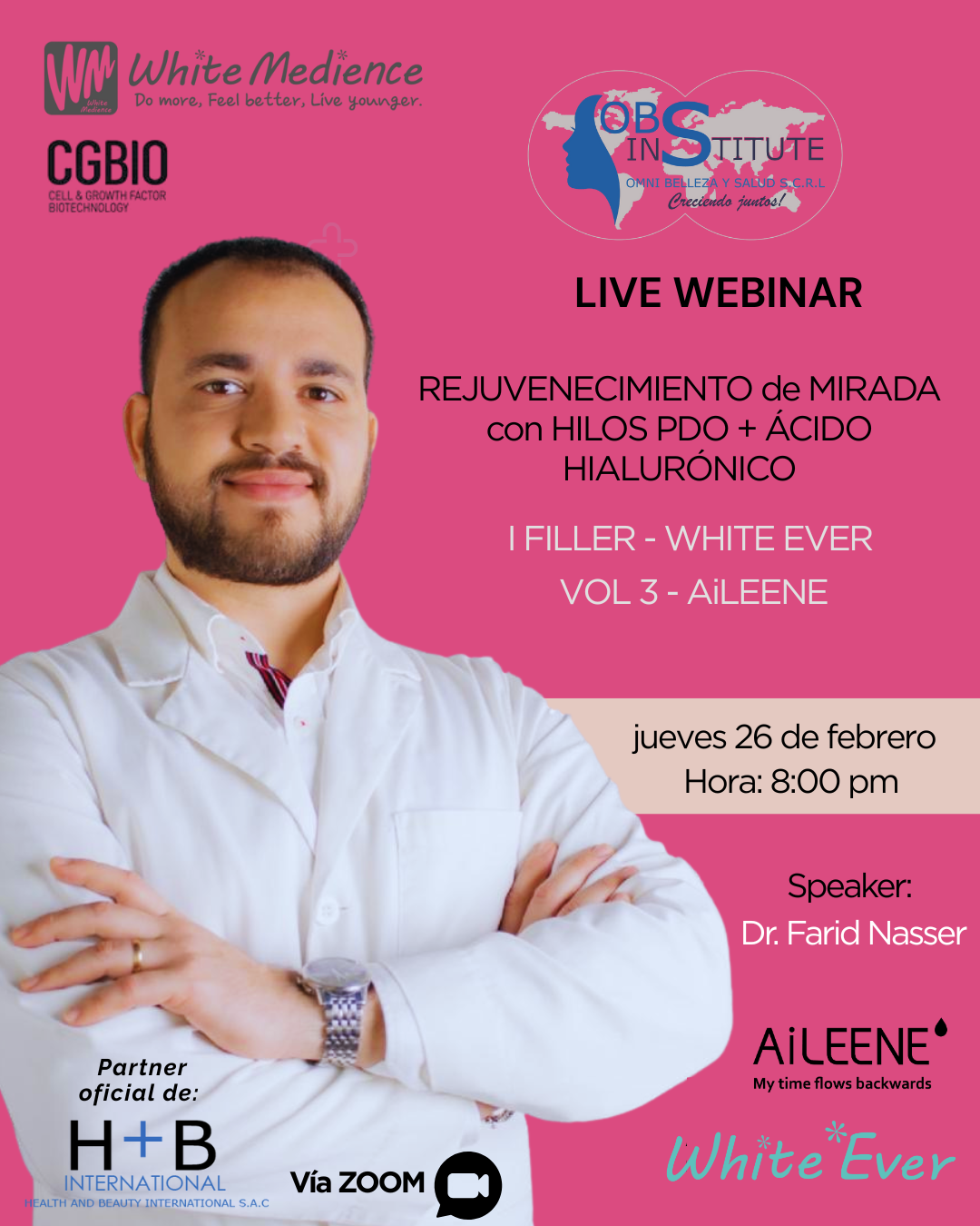 Health and Beauty International – H+B, reafirmando el compromiso de proporcionar productos de calidad internacional, así como del correcto entrenamiento acerca de la aplicación de estos, nos complace invitarlos al 𝐖𝐄𝐁𝐈𝐍𝐀𝐑 – Rejuvenecimiento de Mirada con Hilos PDO I FILLER + ÁCIDO HIALURÓNICO AILEENE VO.3, organizado por nuestro partner oficial OBS Institute de Omni Belleza y Salud.