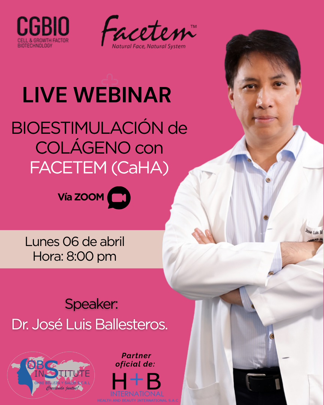 Health and Beauty International – H+B, reafirmando el compromiso de proporcionar productos de calidad internacional, así como del correcto entrenamiento acerca de la aplicación de estos, nos complace invitarlos al WEBINAR – BIOESTIMULACIÓN de COLÁGENO con FACETEM (CaHA), organizado por nuestro partner oficial OBS Institute de Omni Belleza y Salud.